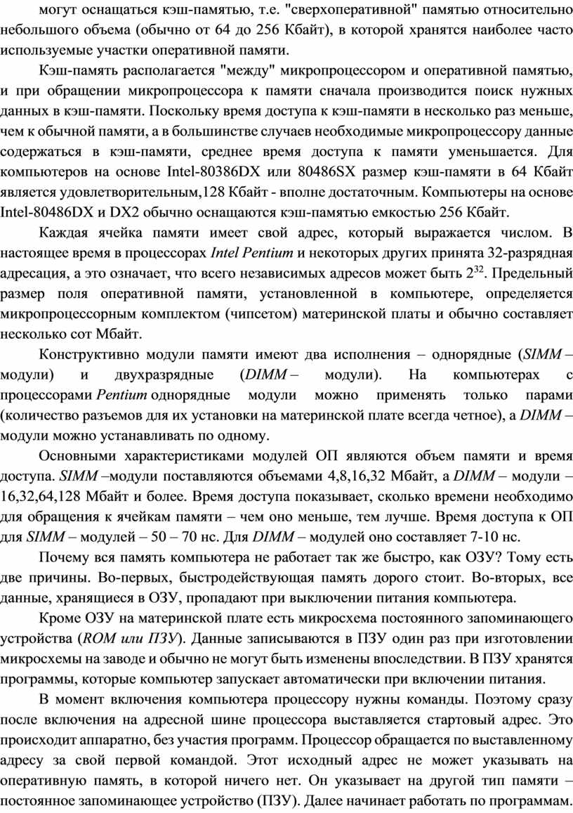 Кэш-память располагается "между" микропроцессором и оперативной памятью, и при обращении микропроцессора к памяти сначала производится поиск нужных данных в кэш-памяти. Поскольку время доступа к кэш-памяти в несколько раз меньше, чем к обычной памяти, а в большинстве случаев необходимые микропроцессору данные содержаться в кэш-памяти, среднее время доступа к памяти уменьшается. Для компьютеров на основе Intel-80386DX или 80486SX размер кэш-памяти в 64 Кбайт является удовлетворительным,128 Кбайт - вполне достаточным. Компьютеры на основе Intel-80486DX и DX2 обычно оснащаются кэш-памятью емкостью 256 Кбайт.