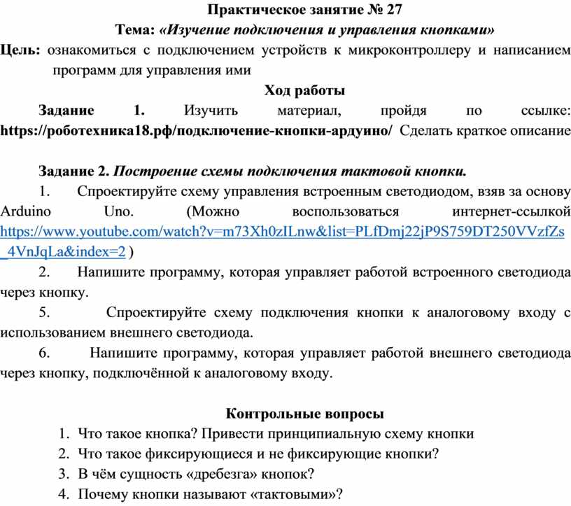 Задание 1. Изучить материал, пройдя по ссылке: https://роботехника18.рф/подключение-кнопки-ардуино/ Сделать краткое описание