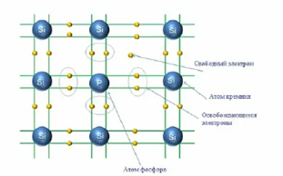 Каждый атом кремния состоит из четырех валентных электронов, а каждый атом фосфора состоит из пяти валентных электронов. Четыре валентных электрона атома фосфора образуют четыре ковалентные связи с соседними четырьмя атомами кремния. Однако пятый валентный электрон атома фосфора не может образовывать ковалентную связь с атомом кремния, поскольку атом кремния имеет только четыре валентных электрона. Следовательно, пятый валентный электрон каждого атома фосфора освобождается от атома. Таким образом, каждый атом фосфора генерирует свободный электрон.