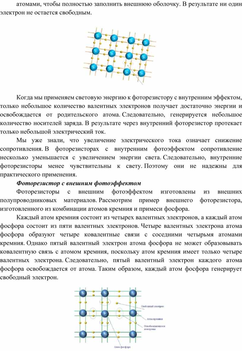 Фоторезисторы с внешним фотоэффектом изготовлены из внешних полупроводниковых материалов. Рассмотрим пример внешнего фоторезистора, изготовленного из комбинации атомов кремния и примеси фосфора.
