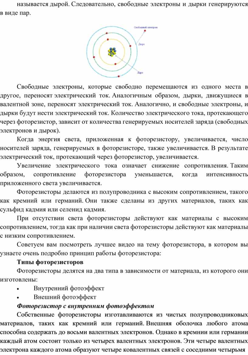 Когда свет падает на фоторезистор, некоторые из валентных электронов поглощают энергию света и разрушают связь с атомами. Валентные электроны, которые разрушают связь с атомами, называются свободными электронами.