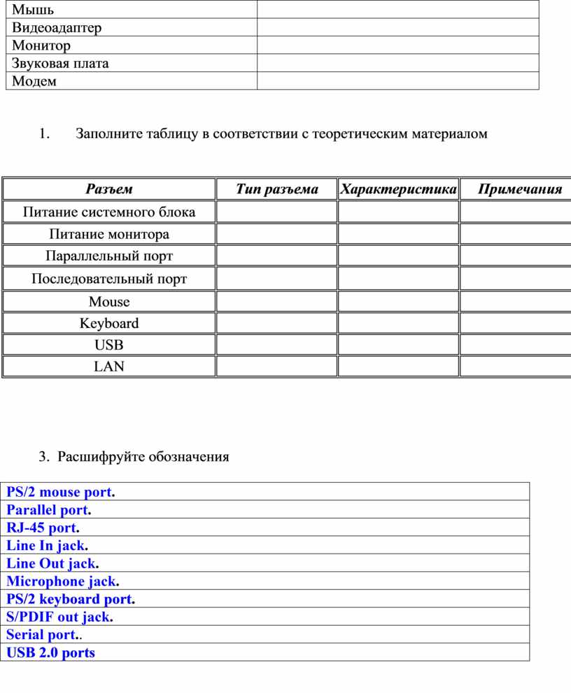 Цель: изучение основных компонентов персонального компьютера и основных видов периферийного оборудования, способов их подключения, основных характеристик (название, тип разъема, скорость передачи данных, дополнительные свойства).