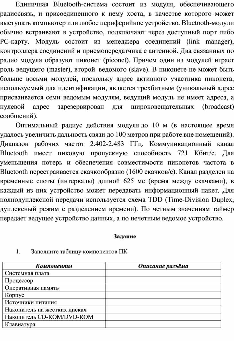 1. Заполните таблицу компонентов ПК