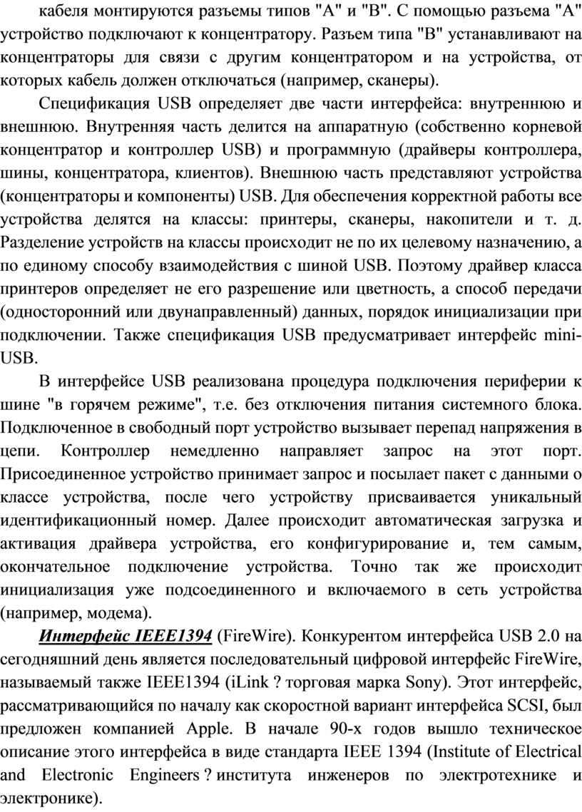 Интерфейс IEEE1394 (FireWire). Конкурентом интерфейса USB 2.0 на сегодняшний день является последовательный цифровой интерфейс FireWire, называемый также IEEE1394 (iLink ? торговая марка Sony). Этот интерфейс, рассматривающийся по началу как скоростной вариант интерфейса SCSI, был предложен компанией Apple. В начале 90-х годов вышло техническое описание этого интерфейса в виде стандарта IEEE 1394 (Institute of Electrical and Electronic Engineers ? института инженеров по электротехнике и электронике).