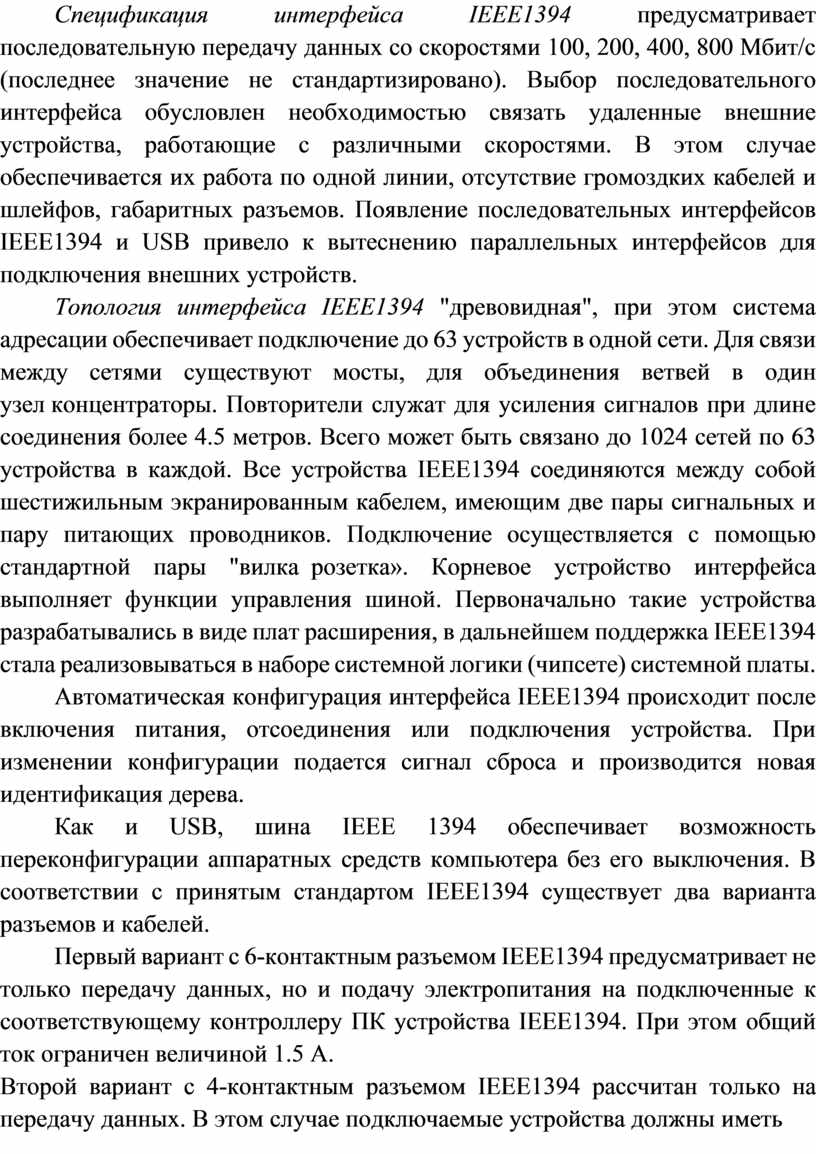 Спецификация интерфейса IEEE1394 предусматривает последовательную передачу данных со скоростями 100, 200, 400, 800 Мбит/с (последнее значение не стандартизировано). Выбор последовательного интерфейса обусловлен необходимостью связать удаленные внешние устройства, работающие с различными скоростями. В этом случае обеспечивается их работа по одной линии, отсутствие громоздких кабелей и шлейфов, габаритных разъемов. Появление последовательных интерфейсов IEEE1394 и USB привело к вытеснению параллельных интерфейсов для подключения внешних устройств.