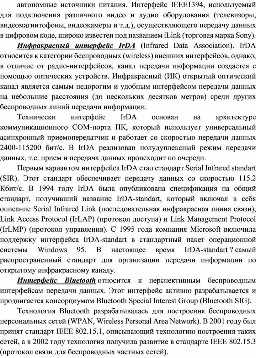 Инфракрасный интерфейс IrDA (Infrared Data Association). IrDA относится к категории беспроводных (wireless) внешних интерфейсов, однако, в отличие от радио-интерфейсов, канал передачи информации создается с помощью оптических устройств. Инфракрасный (ИК) открытый оптический канал является самым недорогим и удобным интерфейсом передачи данных на небольшие расстояния (до нескольких десятков метров) среди других беспроводных линий передачи информации.