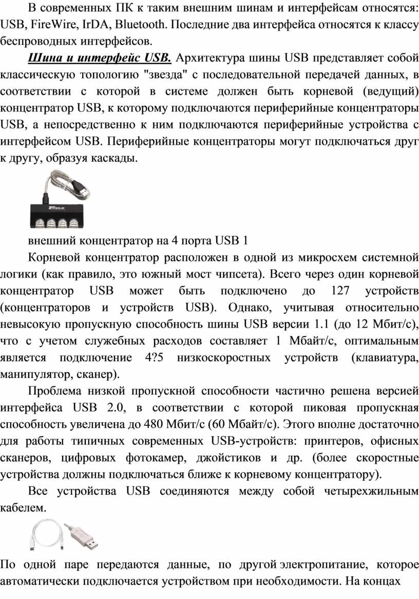 Корневой концентратор расположен в одной из микросхем системной логики (как правило, это южный мост чипсета). Всего через один корневой концентратор USB может быть подключено до 127 устройств (концентраторов и устройств USВ). Однако, учитывая относительно невысокую пропускную способность шины USВ версии 1.1 (до 12 Мбит/c), что с учетом служебных расходов составляет 1 Мбайт/c, оптимальным является подключение 4?5 низкоскоростных устройств (клавиатура, манипулятор, сканер).