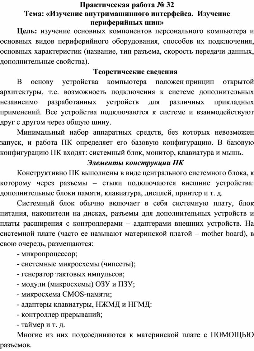 Тема: «Изучение внутримашинного интерфейса. Изучение периферийных шин»