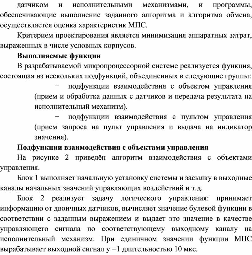 В проекте необходимо разработать структурную схему микропроцессорной системы и схему работы МПС, устройства связи с датчиком и исполнительными механизмами, и программы, обеспечивающие выполнение заданного алгоритма и алгоритма обмена, осуществляется оценка характеристик МПС.