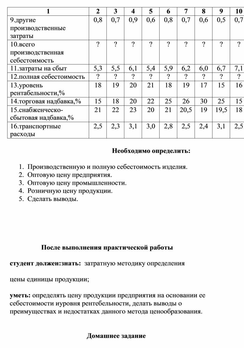 После выполнения практической работы студент должен: знать: затратную методику определения цены единицы продукции;