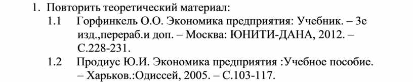 1.1 Горфинкель О.О. Экономика предприятия: Учебник. – 3е изд.,перераб. и доп. – Москва: ЮНИТИ-ДАНА, 2012. – С.228-231.