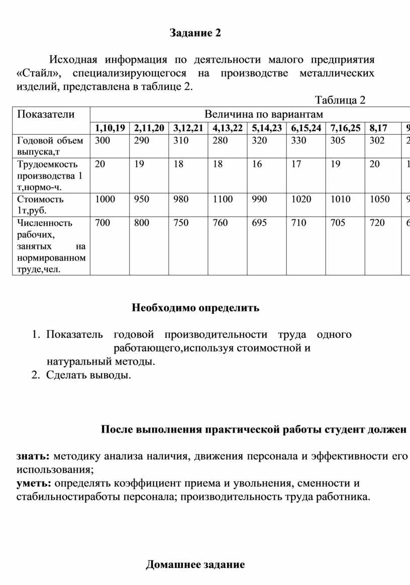 уметь: определять коэффициент приема и увольнения, сменности и стабильности работы персонала; производительность труда работника.
