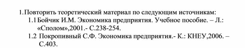1.1 Бойчик И.М. Экономика предприятия. Учебное пособие. – Л.: «Сполом», 2001.- С.238-254.