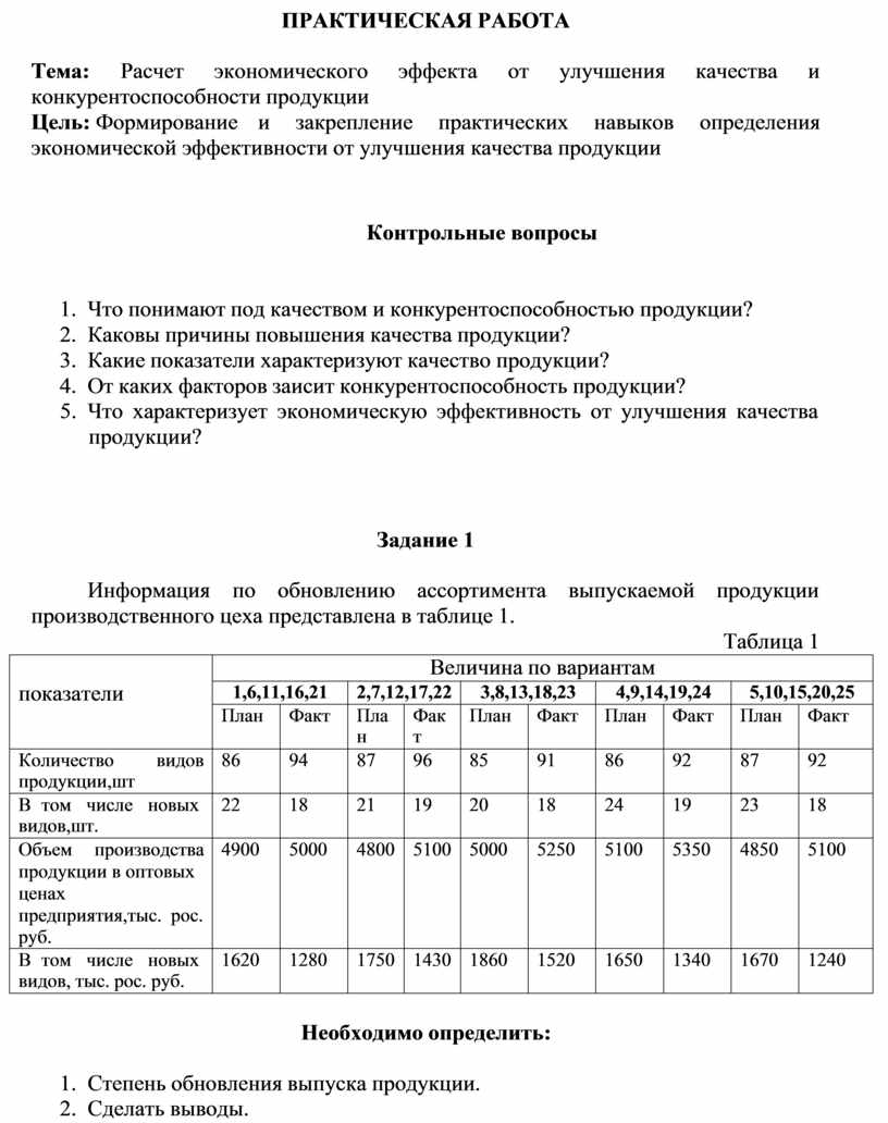 уметь: определять степень обновления продукции, экономическую эффективность от улучшения качества продукции, делать выводы.