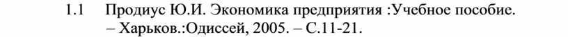 1.1 Продиус Ю.И. Экономика предприятия :Учебное пособие. – Харьков.: Одиссей, 2005. – С.11-21.
