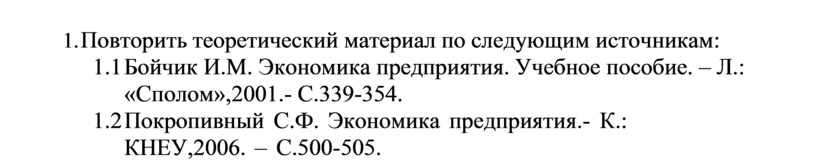 1.1 Бойчик И.М. Экономика предприятия. Учебное пособие. – Л.: «Сполом», 2001.- С.339-354.