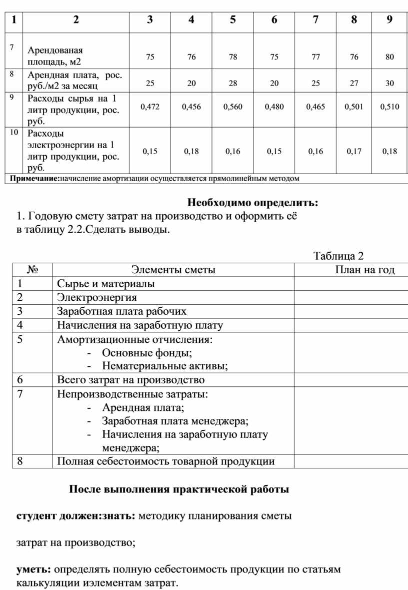 После выполнения практической работы студент должен: знать: методику планирования сметы затрат на производство;