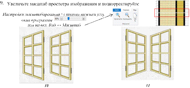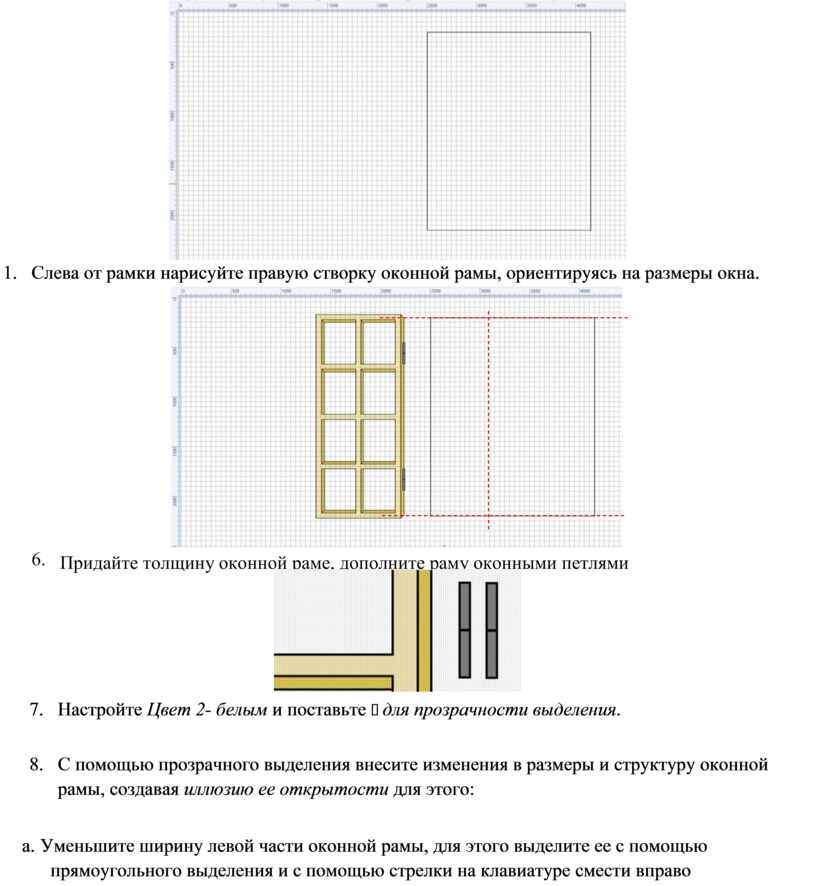 8. С помощью прозрачного выделения внесите изменения в размеры и структуру оконной рамы, создавая иллюзию ее открытости для этого: