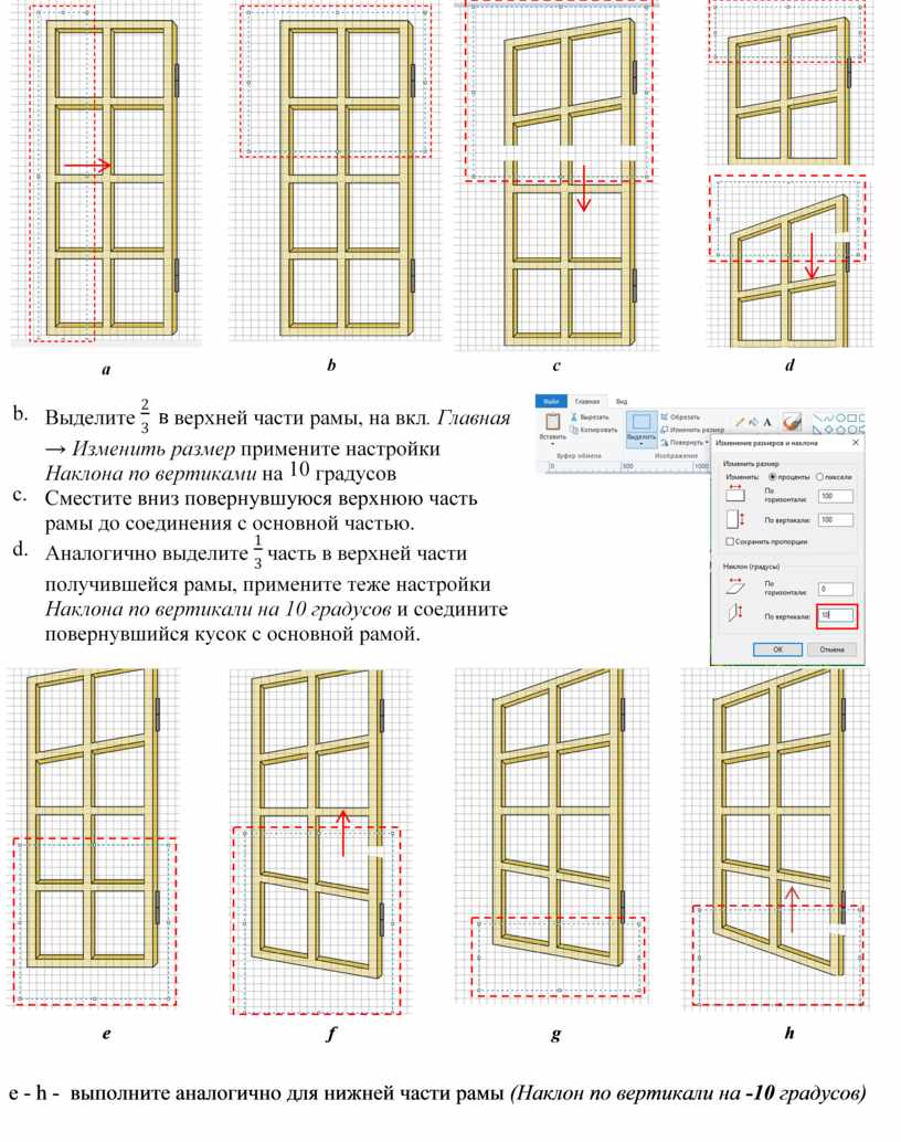 е - h - выполните аналогично для нижней части рамы (Наклон по вертикали на -10 градусов)