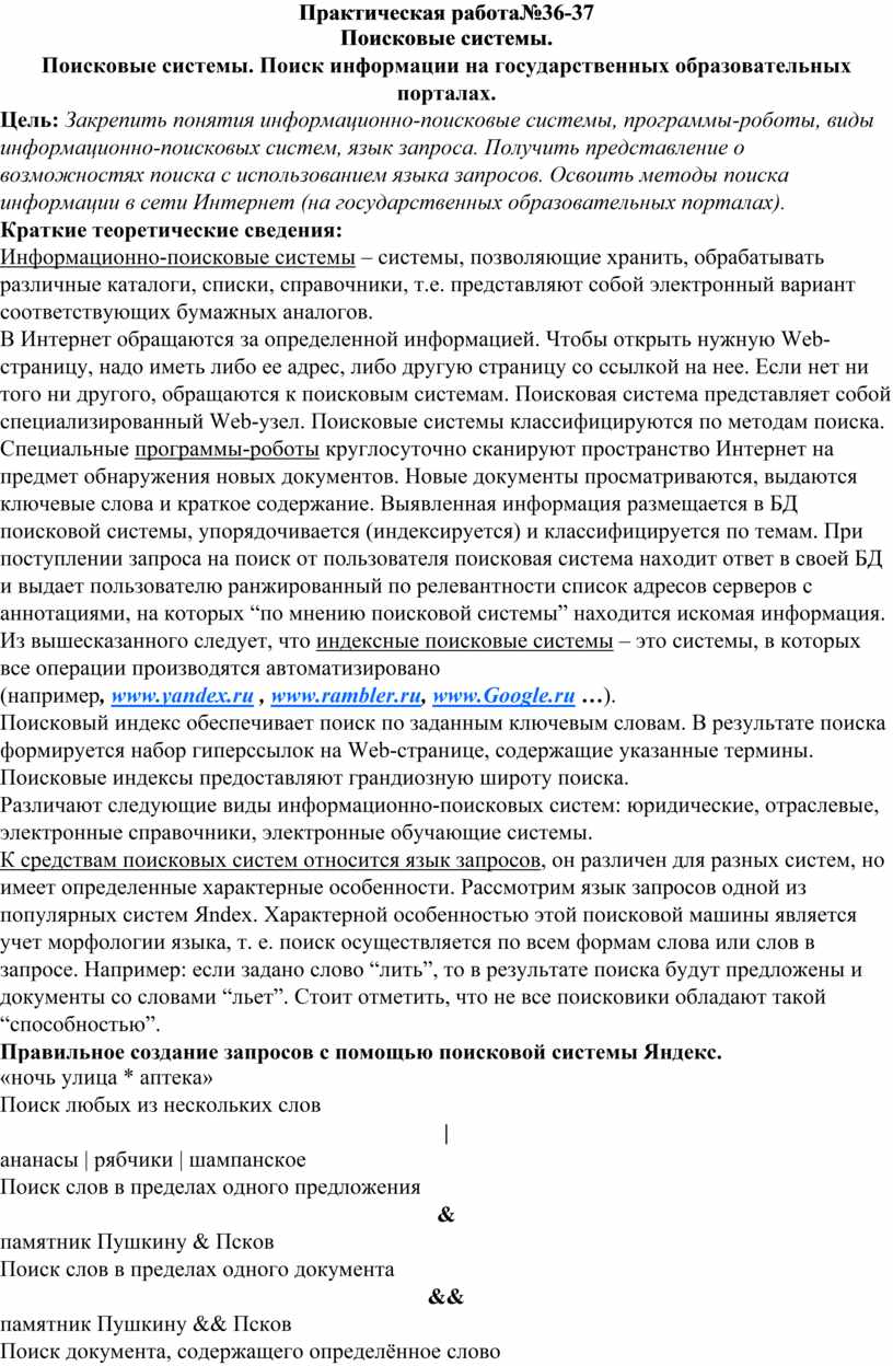 Цель: Закрепить понятия информационно-поисковые системы, программы-роботы, виды информационно-поисковых систем, язык запроса. Получить представление о возможностях поиска с использованием языка запросов. Освоить методы поиска информации в сети Интернет (на государственных образовательных порталах).