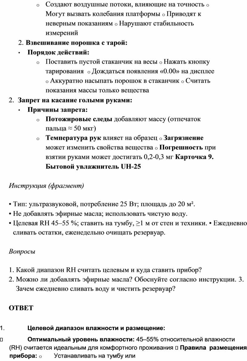o Температура рук влияет на образец o Загрязнение может изменить свойства вещества o Погрешность при взятии руками может достигать 0,2-0,3 мг Карточка 9. Бытовой увлажнитель UH-25