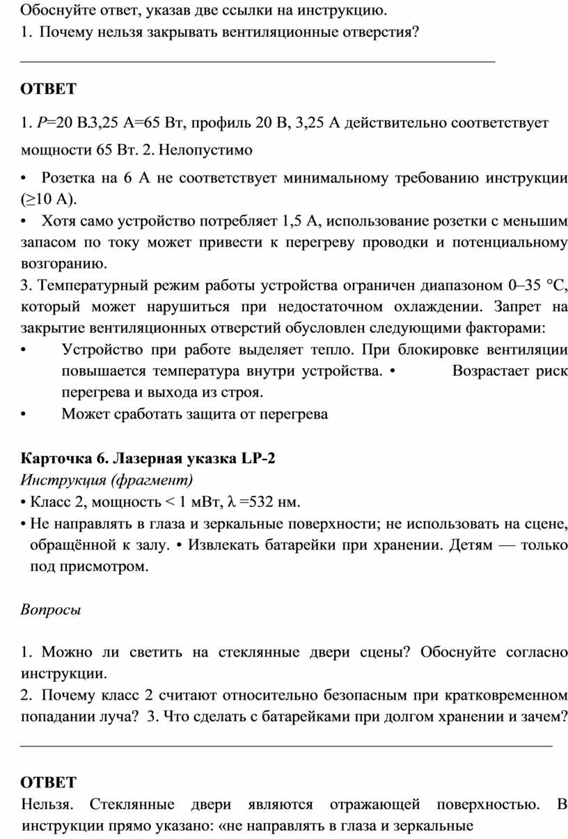 Ниже представлены 5 карточек, содержащие фрагменты инструкций. Каждая содержит 3 вопроса. Автор постарался ответить на поставленные вопросы.