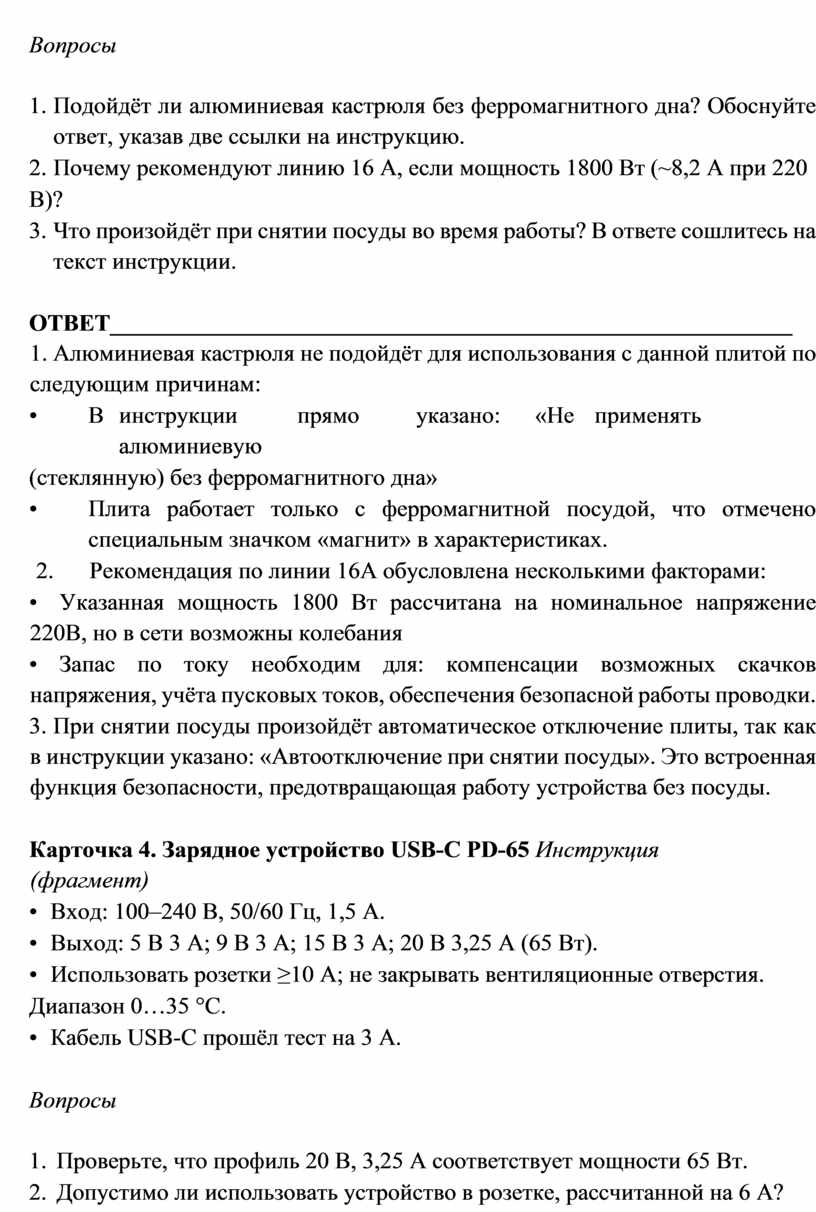 1. Подойдёт ли алюминиевая кастрюля без ферромагнитного дна? Обоснуйте ответ, указав две ссылки на инструкцию.