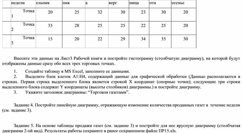 Задание 5. На основе таблицы продажи газет (см. задание 3) и постройте для нее ярусную диаграмму (столбчатая диаграмма 2-ой вид). Результаты работы сохраните в ранее сохраненном файле ПР15.xls.