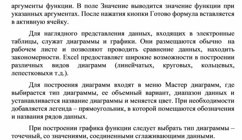 Для наглядного представления данных, входящих в электронные таблицы, служат диаграммы и графики. Они размещаются обычно на рабочем листе и позволяют проводить сравнение данных, находить закономерности. Excel предоставляет широкие возможности в построении различных видов диаграмм (линейчатых, круговых, кольцевых, лепестковых и т.д.).