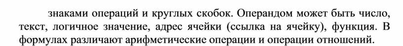 Формула — это совокупность операндов, соединенных между собой знаками операций и круглых скобок. Операндом может быть число, текст, логичное значение, адрес ячейки (ссылка на ячейку), функция. В формулах различают арифметические операции и операции отношений.