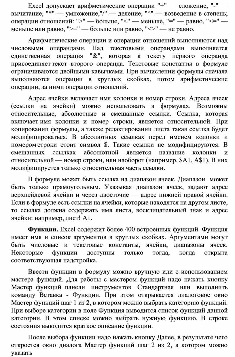 Excel допускает арифметические операции "+" — сложение, "-" — вычитание, "*" — умножение,"/" — деление, "^" — возведение в степень; операции отношений: ">" — больше, "<" — меньше, "=" — равно, "<=" — меньше или равно, ">=" — больше или равно, "<>" — не равно.