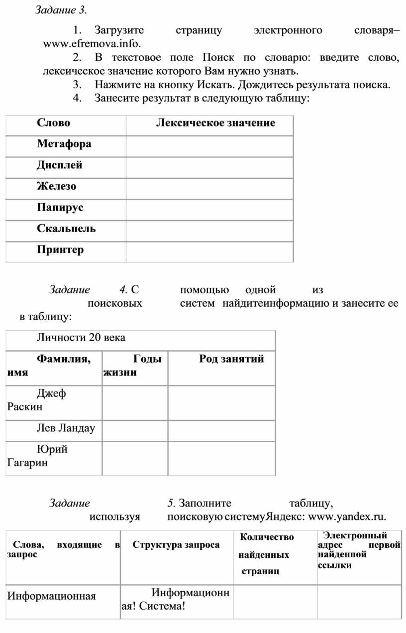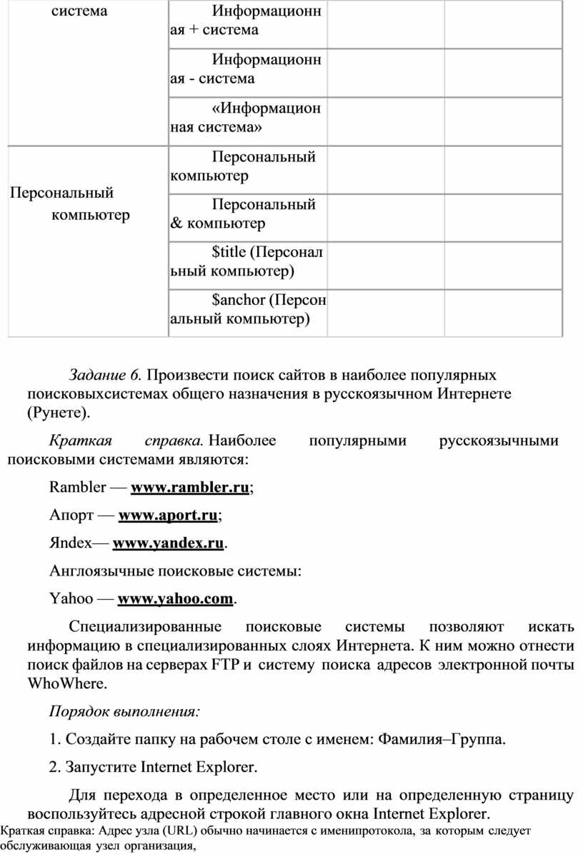 Задание 5. Заполните таблицу, используя поисковую систему Яндекс: www.yandex.ru.