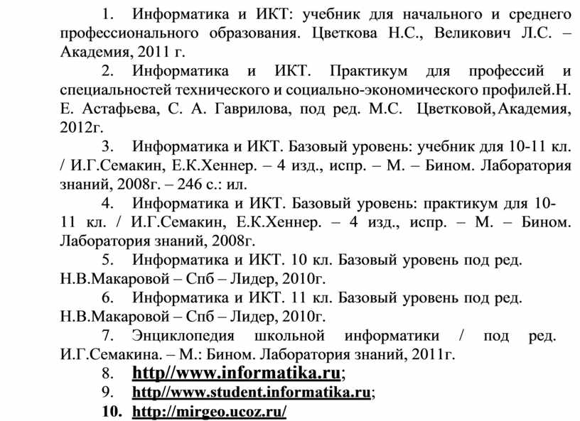 1. Информатика и ИКТ: учебник для начального и среднего профессионального образования. Цветкова Н.С., Великович Л.С. – Академия, 2011 г.