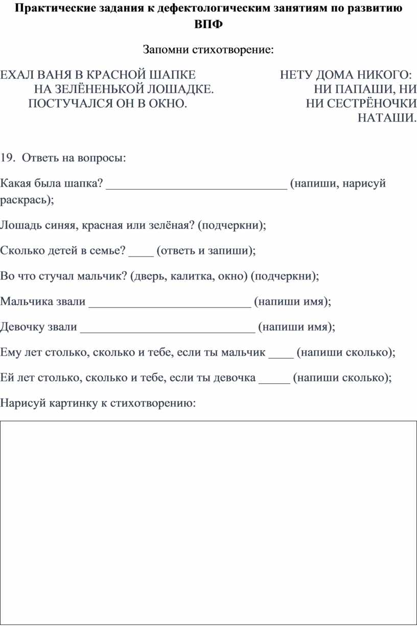 Практические задания к дефектологическим занятиям по развитию ВПФ