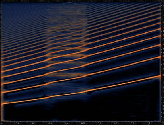 сигнала. Теперь совершенно очевидно, что происходит с высотой (частотой) звука: она движется вверх! В спектрограмме, горизонтальная ось показывает время, как и в осциллограмме. Но теперь, вертикальная ось показывает нам, частоту в Гц. При этом, мы по прежнему можем видеть, насколько громки события по тому, насколько ярко изображение. Черный фон - тишина, в то время как ярко-оранжевому цвету соответствует бОльшая громкость.