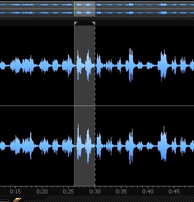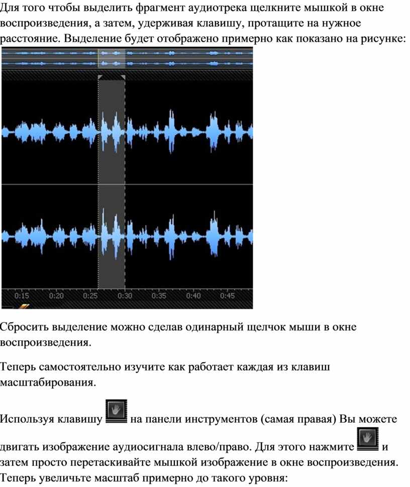 Для того чтобы выделить фрагмент аудиотрека щелкните мышкой в окне воспроизведения, а затем, удерживая клавишу, протащите на нужное расстояние. Выделение будет отображено примерно как показано на рисунке: