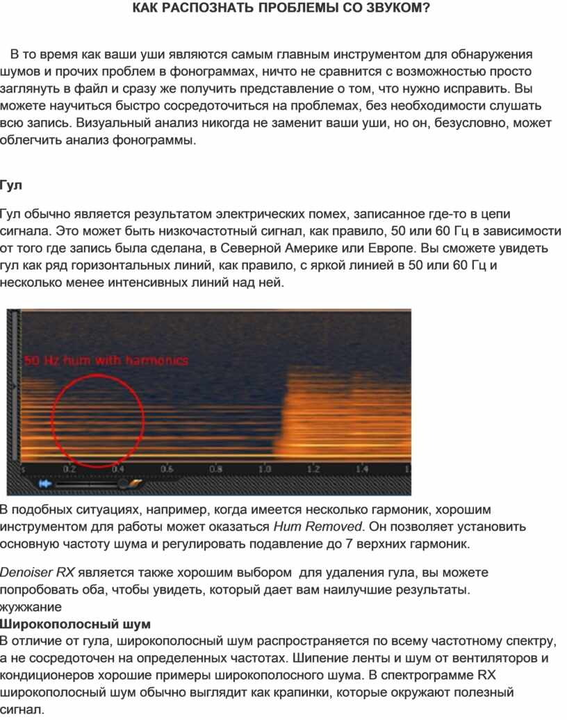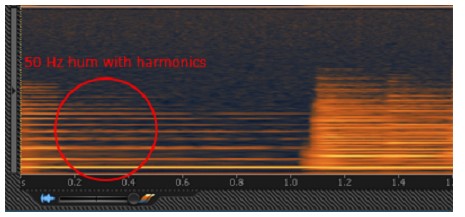 Гул обычно является результатом электрических помех, записанное где-то в цепи сигнала. Это может быть низкочастотный сигнал, как правило, 50 или 60 Гц в зависимости от того где запись была сделана, в Северной Америке или Европе. Вы сможете увидеть гул как ряд горизонтальных линий, как правило, с яркой линией в 50 или 60 Гц и несколько менее интенсивных линий над ней.