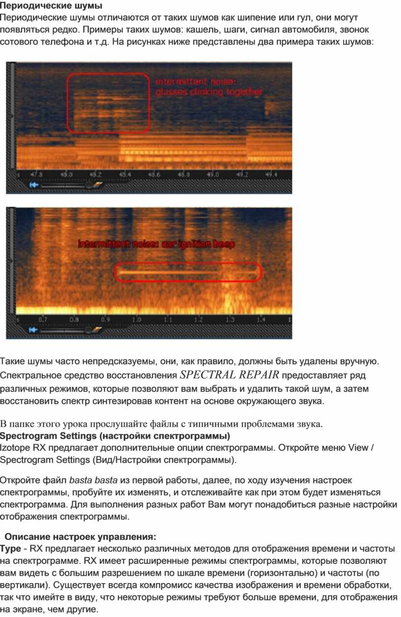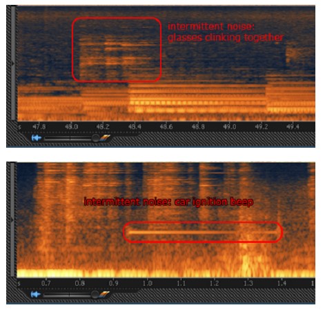 Периодические шумы отличаются от таких шумов как шипение или гул, они могут появляться редко. Примеры таких шумов: кашель, шаги, сигнал автомобиля, звонок сотового телефона и т.д. На рисунках ниже представлены два примера таких шумов:
