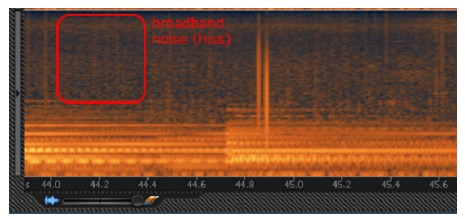 В отличие от гула, широкополосный шум распространяется по всему частотному спектру, а не сосредоточен на определенных частотах. Шипение ленты и шум от вентиляторов и кондиционеров хорошие примеры широкополосного шума. В спектрограмме RX широкополосный шум обычно выглядит как крапинки, которые окружают полезный сигнал.