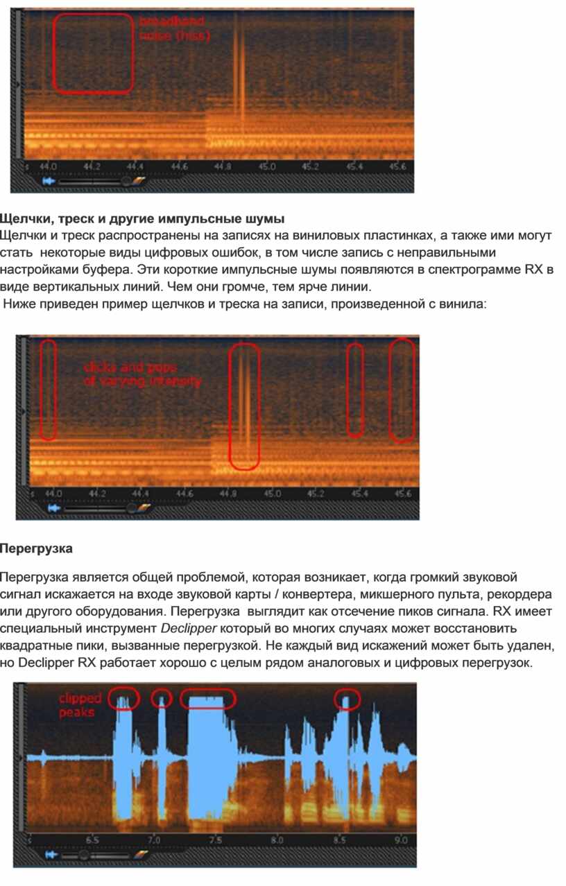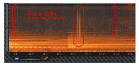 Щелчки и треск распространены на записях на виниловых пластинках, а также ими могут стать некоторые виды цифровых ошибок, в том числе запись с неправильными настройками буфера. Эти короткие импульсные шумы появляются в спектрограмме RX в виде вертикальных линий. Чем они громче, тем ярче линии.