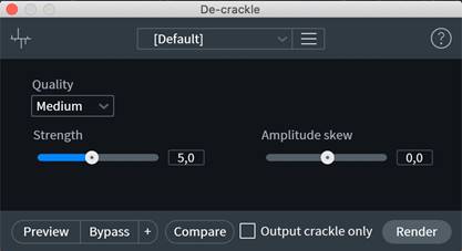 Откройте De-crackle. Поставьте максимальное (High) качество (Quality). При помощи Compare сделайте несколько вариантов с разным шумоподавлением (Strength). Выберите наиболее удачный вариант, после чего таким же образом определитесь с положением регулятора Amplitude skew. Так как треск достаточно тихий, то Вам скорее подойдут отрицательные значения Amplitude skew. Для того что бы убедиться, что полезный сигнал не будет подавляться вместе со щелчками, поставьте галочку Output crackle only. При необходимости проведите дополнительную настройку Strength и Amplitude skew. Нажмите Render, De-crackle будет применен.