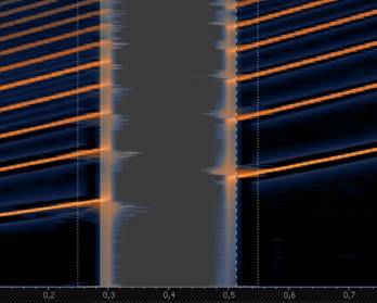 Откройте модуль Spectral Repair. Выделите при помощи инструмента Time-frequency selection tool обе гармоники как показано на рисунке 8.2. Для того чтобы выделить сразу несколько участков удерживайте клавишу Shift.