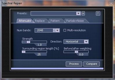 Такие шумы часто непредсказуемы, они, как правило, должны быть удалены вручную. Спектральное средство восстановления SPECTRAL REPAIR предоставляет ряд различных режимов, которые позволяют вам выбрать и удалить такой шум, а затем восстановить спектр синтезировав контент на основе окружающего звука.