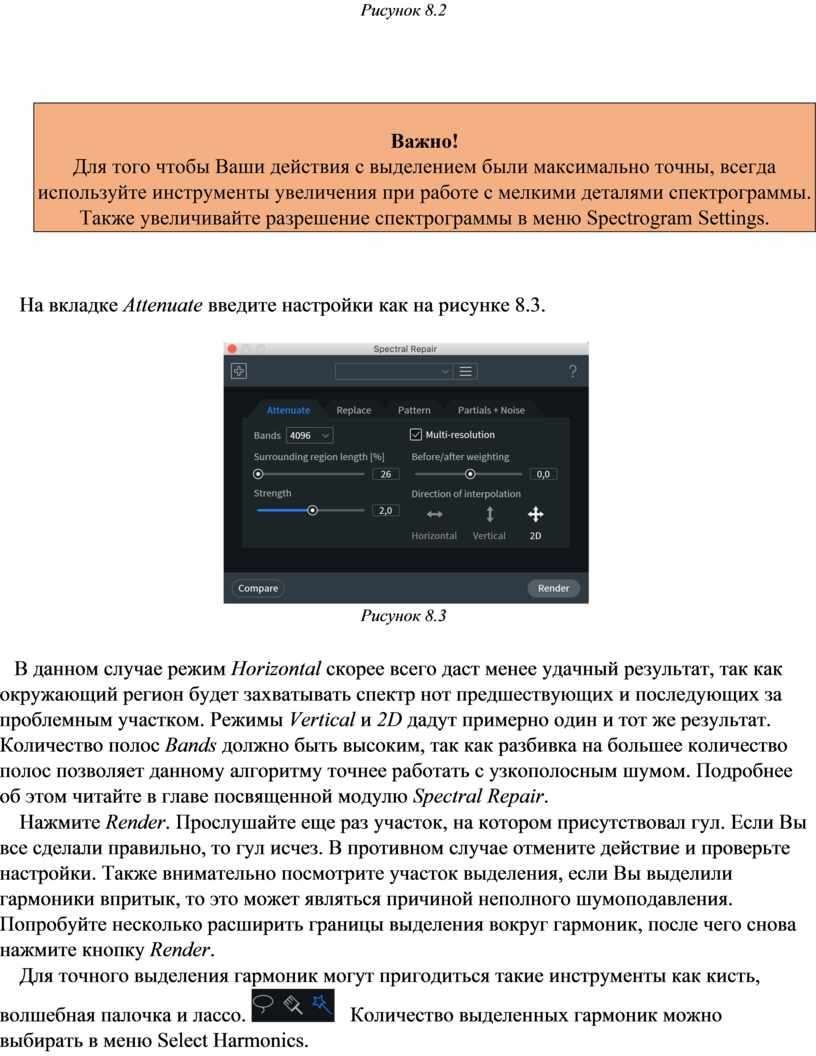 В данном случае режим Horizontal скорее всего даст менее удачный результат, так как окружающий регион будет захватывать спектр нот предшествующих и последующих за проблемным участком. Режимы Vertical и 2D дадут примерно один и тот же результат. Количество полос Bands должно быть высоким, так как разбивка на большее количество полос позволяет данному алгоритму точнее работать с узкополосным шумом. Подробнее об этом читайте в главе посвященной модулю Spectral Repair.