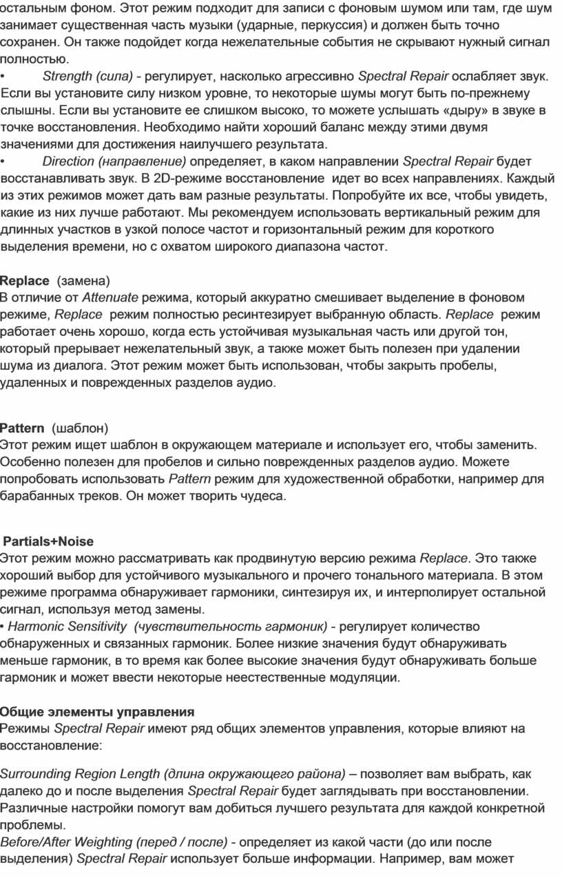 Режимы Spectral Repair имеют ряд общих элементов управления, которые влияют на восстановление: