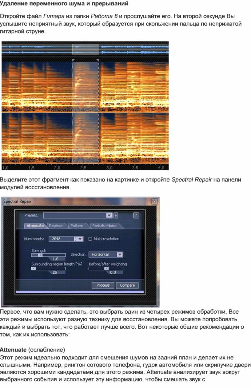 Surrounding Region Length (длина окружающего района) – позволяет вам выбрать, как далеко до и после выделения Spectral Repair будет заглядывать при восстановлении. Различные настройки помогут вам добиться лучшего результата для каждой конкретной проблемы.