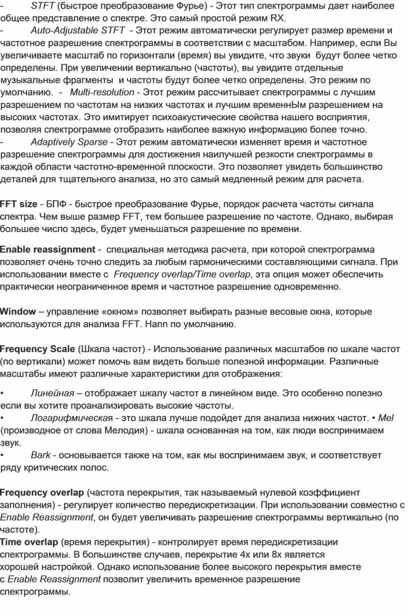 - Auto-Adjustable STFT - Этот режим автоматически регулирует размер времени и частотное разрешение спектрограммы в соответствии с масштабом. Например, если Вы увеличиваете масштаб по горизонтали (время) вы увидите, что звуки будут более четко определены. При увеличении вертикально (частоты), вы увидите отдельные музыкальные фрагменты и частоты будут более четко определены. Это режим по умолчанию. - Multi-resolution - Этот режим рассчитывает спектрограммы с лучшим разрешением по частотам на низких частотах и лучшим временнЫм разрешением на высоких частотах. Это имитирует психоакустические свойства нашего восприятия, позволяя спектрограмме отобразить наиболее важную информацию более точно.