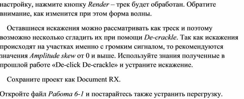 Оставшиеся искажения можно рассматривать как треск и поэтому возможно несколько сгладить их при помощи De-crackle. Так как искажения происходят на участках именно с громким сигналом, то рекомендуются значения Amplitude skew от 0 и выше. Используйте знания полученные в прошлой работе «De-click De-crackle» и устраните искажение.