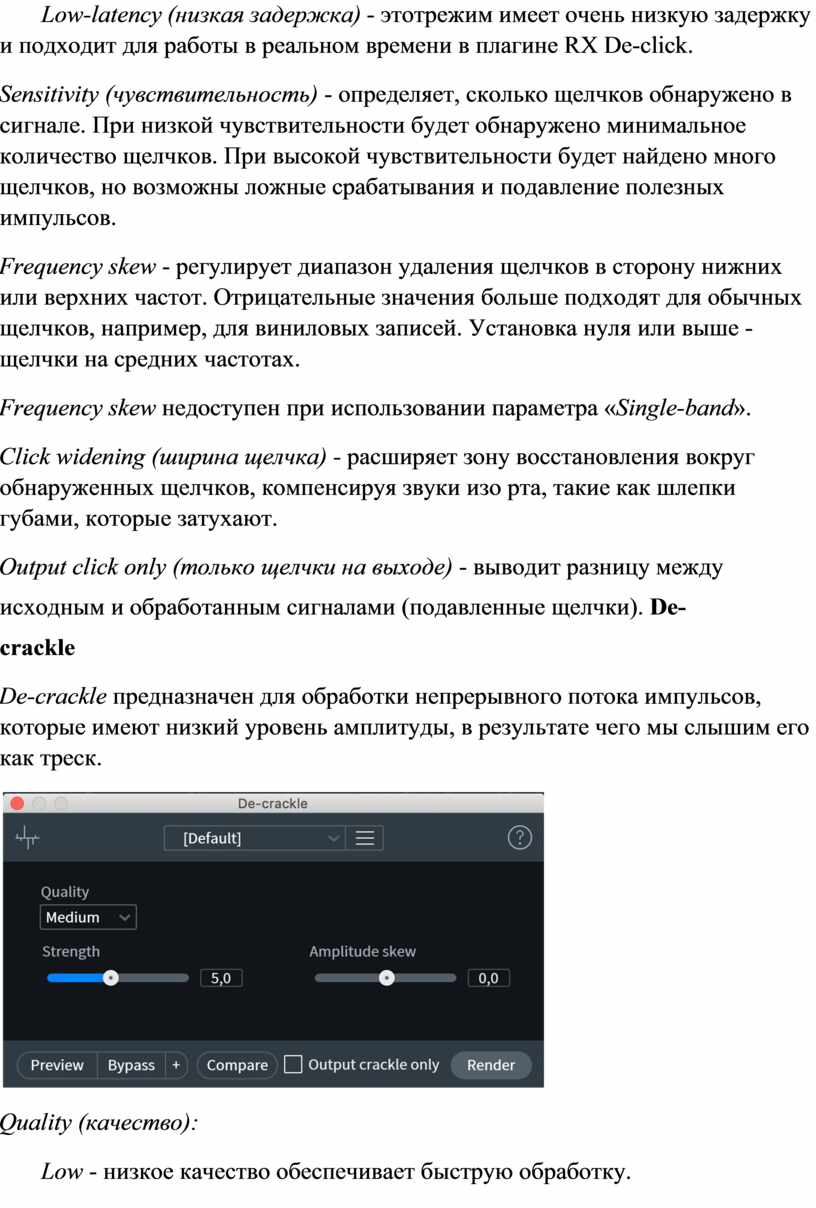 Low-latency (низкая задержка) - этотрежим имеет очень низкую задержку и подходит для работы в реальном времени в плагине RX De-click.