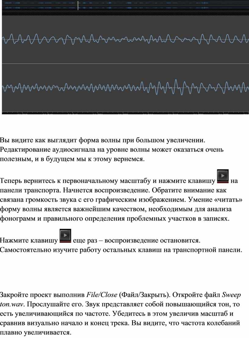 Закройте проект выполнив File/Close (Файл/Закрыть). Откройте файл Sweep ton.wav. Прослушайте его. Звук представляет собой повышающийся тон, то есть увеличивающийся по частоте. Убедитесь в этом увеличив масштаб и сравнив визуально начало и конец трека. Вы видите, что частота колебаний плавно увеличивается.
